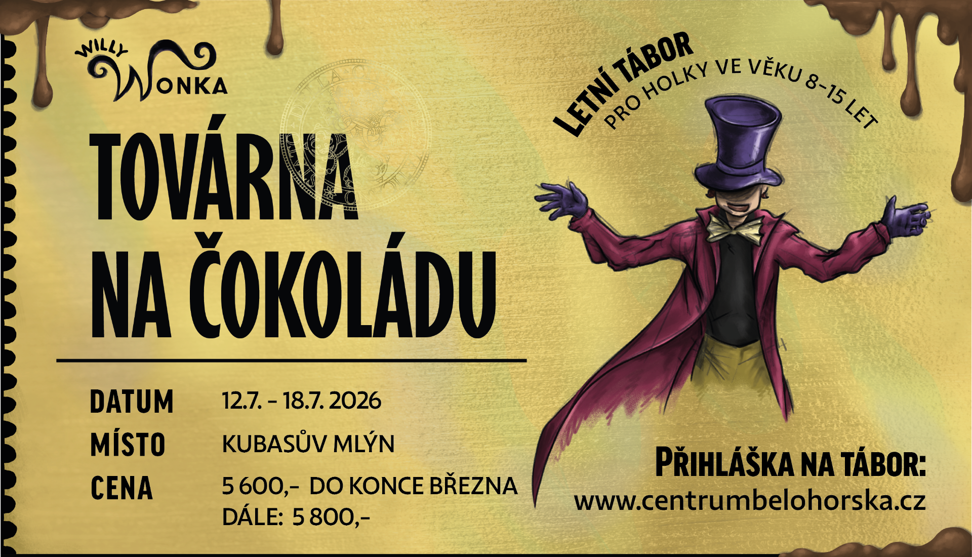 Zveme Tě na náš letní tábor pro holky ve věku 8-15 let. Letos se vydáme na exkurzi s Karlíkem do Továrny na čokoládu. Přihlaš se na toto sladké dobrodružství ještě dnes!