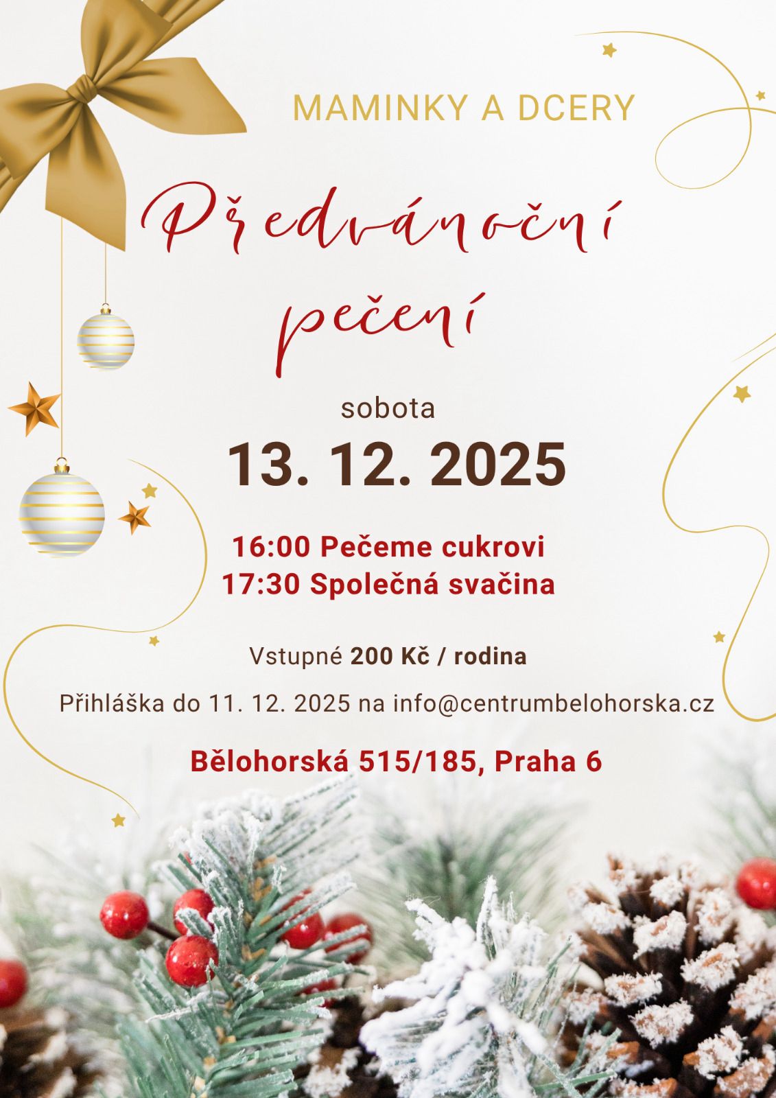 Zveme Vás na Předvánoční pečení pro maminky a dcery, které se bude konat v sobotu 13.12.2025 od 16:00. Budeme se na Vás těšit!